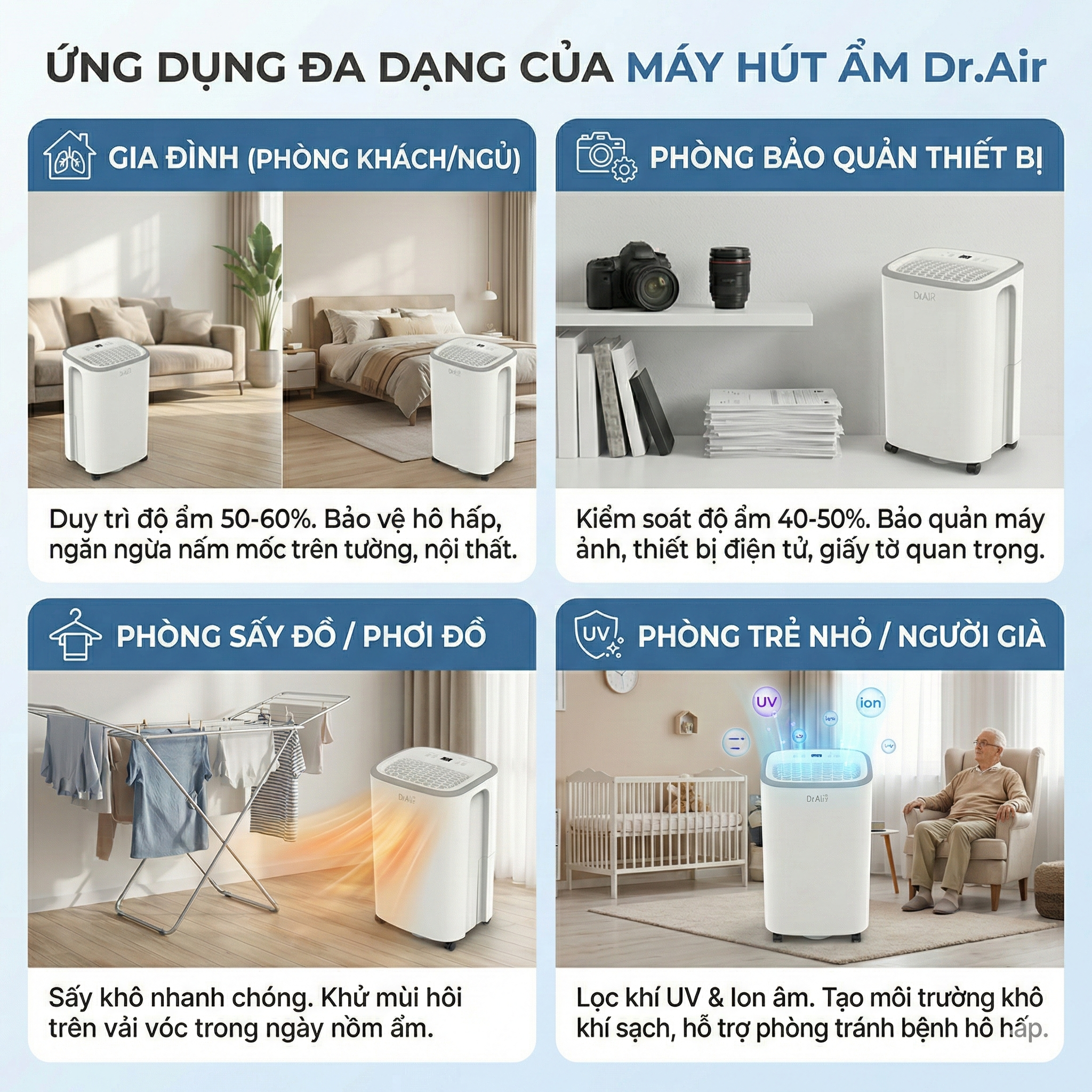Với thiết kế hiện đại, vận hành êm ái và khả năng tùy biến thông số linh hoạt, Dr.Air Dryhome D12 là giải pháp kỹ thuật tối ưu để duy trì chất lượng không khí trong nhà (Indoor Air Quality), bảo vệ sức khỏe hệ hô hấp và kéo dài tuổi thọ cho nội thất, thiết bị điện tử.